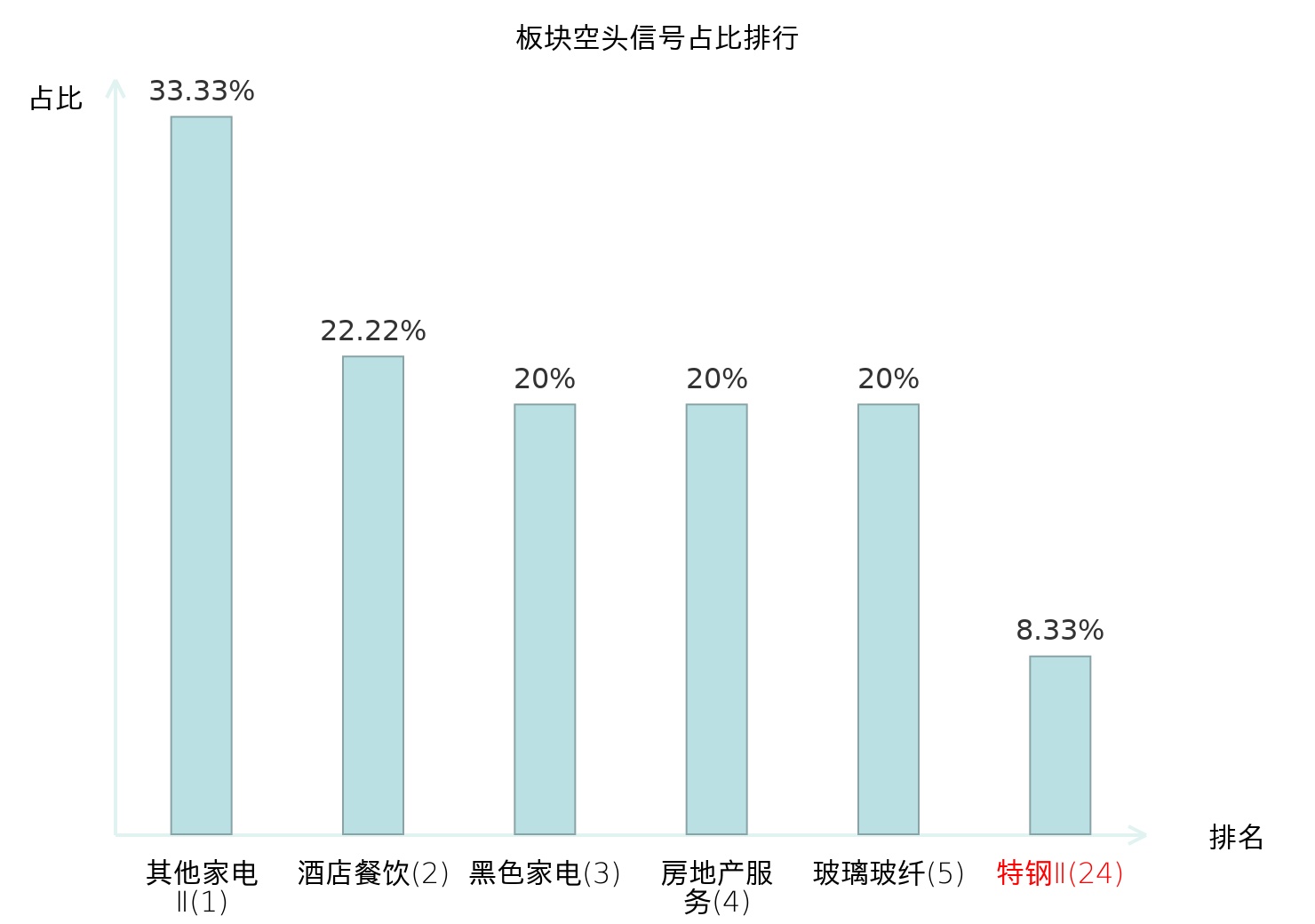 全市场所有行业板块中主力空头信号占比排名中,其他家电Ⅱ板块位居第一。家居用品板块名次提升最快,较昨日上升111位。