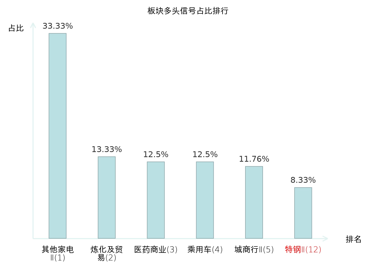 全市场所有行业板块中主力多头信号占比排名中,其他家电Ⅱ板块位居第一。其他家电Ⅱ板块名次提升最快,较昨日上升128位。