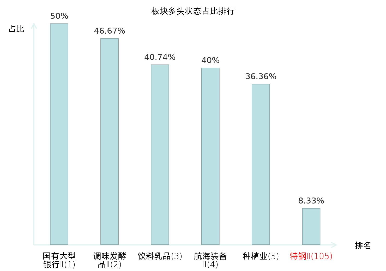 全市场所有行业板块中主力多头状态占比排名中,国有大型银行Ⅱ板块位居第一。金属新材料板块名次提升最快,较昨日上升71位。