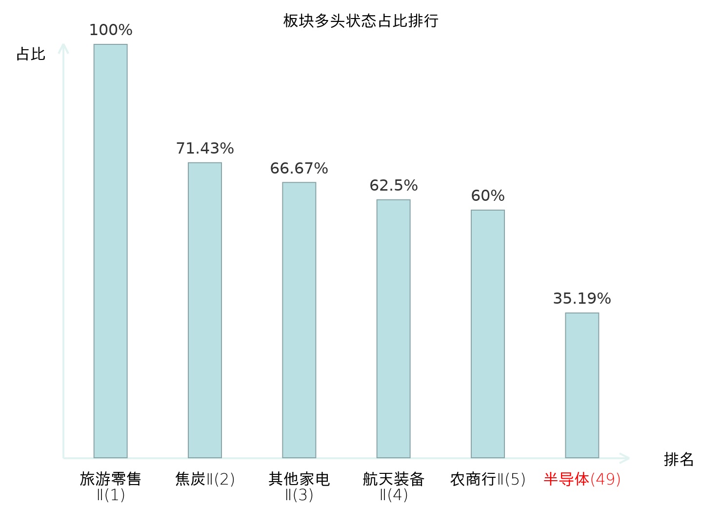全市场所有行业板块中主力多头状态占比排名中,旅游零售Ⅱ板块位居第一。白酒Ⅱ板块名次提升最快,较昨日上升50位。