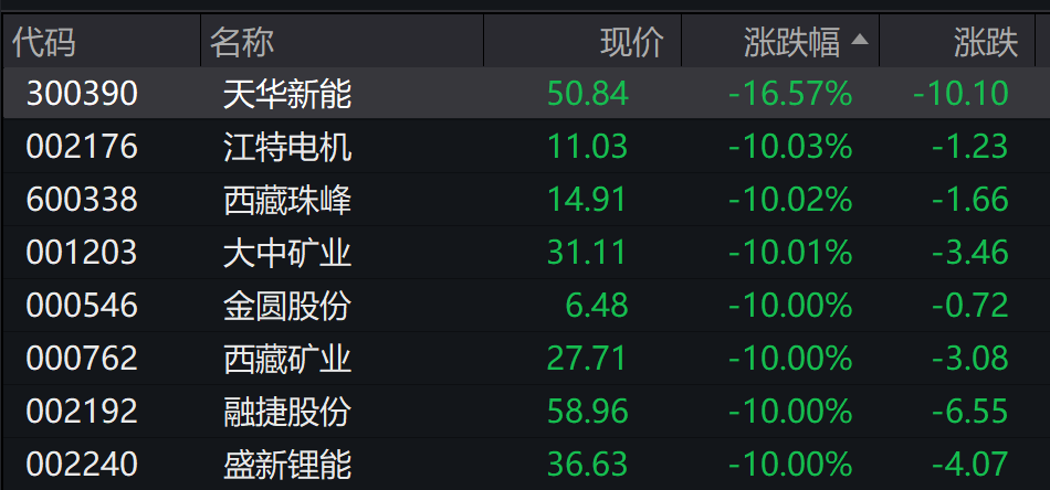 锂矿股领跌,大中矿业、盛新锂能、融捷股份、金圆股份等多只个股跌停。广期所碳酸锂主力合约跌停。