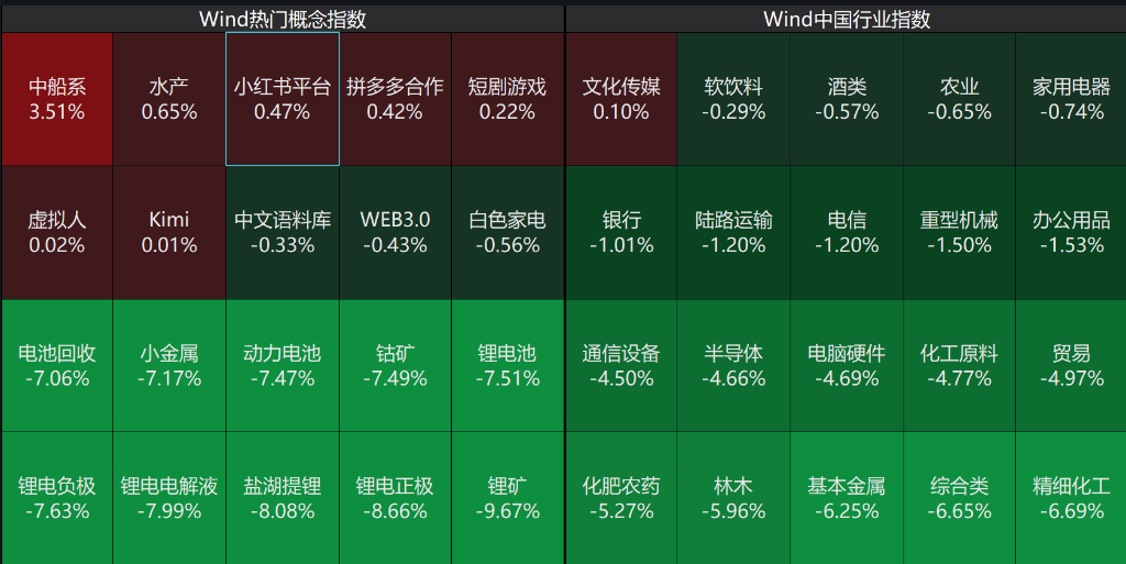 盘面上,股呈现普跌态势,沪深京三市约5100股飘绿,今日成交1.98万亿。板块方面,中船系概念强势领涨,水产、小红书平台、拼多多合作等新消费题材表现活跃;下跌方面,新能源电池产业链全线重挫,锂矿、盐湖提锂、锂电正极等上游资源品领跌,锂电电解液、动力电池等中下游环节集体跟跌,小金属、钴矿等资源板块同步走弱,通信设备、半导体、化工原料等制造业板块普遍调整。