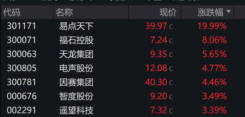 AI应用概念逆势拉升,易点天下、欢瑞世纪涨停,福石控股、榕基软件等跟涨。