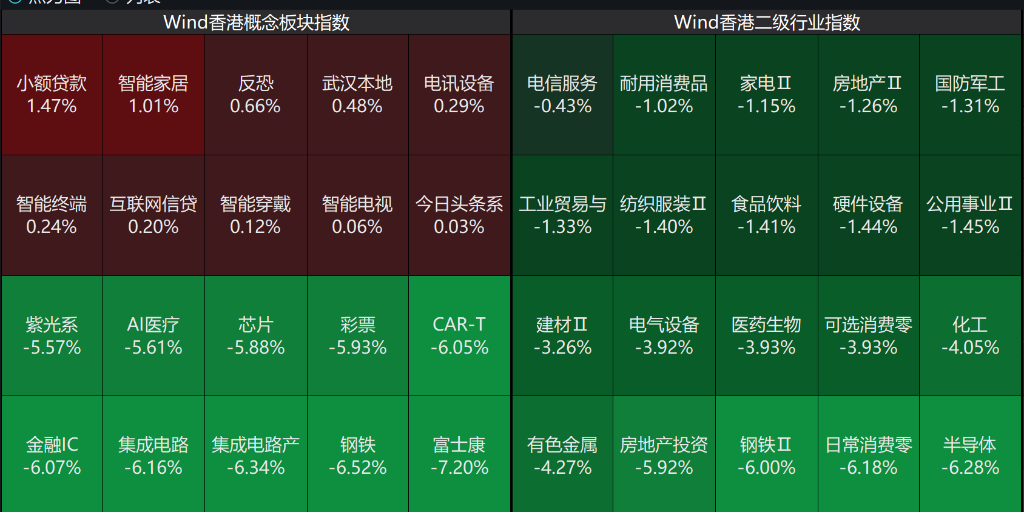 板块方面,今日港股市场呈现明显避险情绪,科技硬件与周期板块成为下跌主力,集成电路、半导体等硬科技赛道普遍承压。小额贷款与智能家居等内需型概念相对抗跌,医药板块调整或与行业政策预期变化有关。整体看,市场风险偏好快速收敛,结构分化加剧。