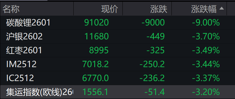 商品多数下跌,新能源材料跌幅居前,碳酸锂跌8.02%,贵金属全部下跌,沪银跌3.23%。