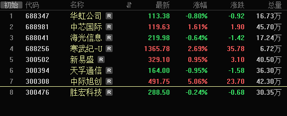 而AI硬件这边前两天上方这8大趋势抱团都是下跌的,昨天更是大跌,今天则一半跌,一半涨,中际旭创涨超5%,寒武纪涨近3%。中际旭创这里下方是前期平台的支撑,有恰好也是30日线的位置支撑,今天科技情绪止跌回暖,因此反弹起来也毕竟快。总之这里稳指数的核心在缩量的局面下,确实是拉权重股是最优的选择,但散户却不一定赚钱,因此很考验配置的策略选择上。