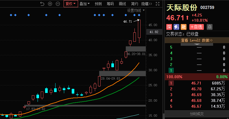 而下午新能源反弹的关键有宁德时代的董事长的一个助攻,宁德时代表现第五代的磷酸铁锂电池产品已经开始量产,在能力密度和循环寿命上都有新的突破,因此今天下午电解液相关的上游个股又出现回暖。石大胜华涨停、粤桂股份、永太科技涨停、趋势风向标,天际股份再度大涨涨停,带动多氟多,天赐材料回暖。早盘6F三杰都是跌的,这里天际股份还在5日线上方,但要注意底部的筹码逐步减少,筹码峰上移,这里如若没有继续的催化,短期风吹草动对股价的影响也会很明显(毕竟30天200%的异动监管到了是个考验),因此还是维持中午的观点,没有底舱的选手谨慎一点,多看少动。