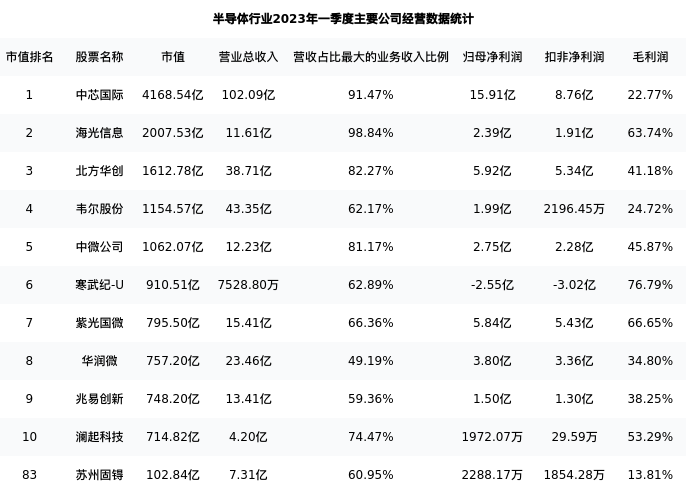 苏州固锝最新报告期数据为一季度,下表汇总了半导体行业内市值靠前的公司一季度主要经营数据