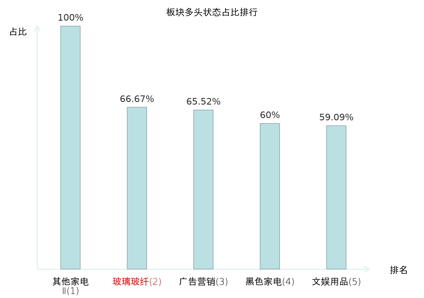 全市场所有行业板块中主力多头状态占比排名中,其他家电Ⅱ板块位居第一。体育Ⅱ板块名次提升最快,较昨日上升57位。