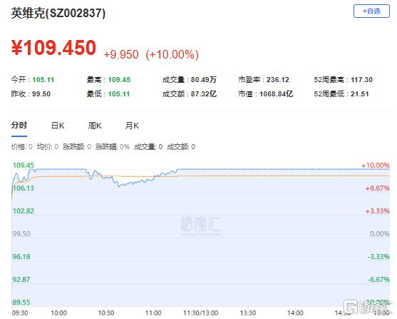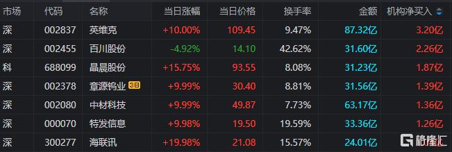 英维克:今日涨停,全天换手率9.47%,成交额87.32亿元,振幅4.13%。龙虎榜数据显示,机构净买入3.20亿元,深股通净买入4.73亿元,营业部席位合计净买入1.41亿元。