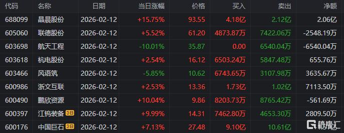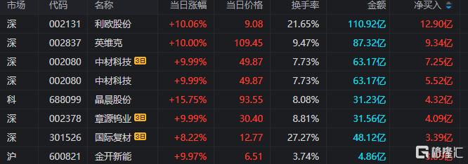 晶晨股份:上涨15.75%,换手率8.08%,成交量34.03万手,成交额31.23亿元。龙虎榜数据显示,机构合计净买入1.87亿元,北向资金合计净买入2.06亿元。