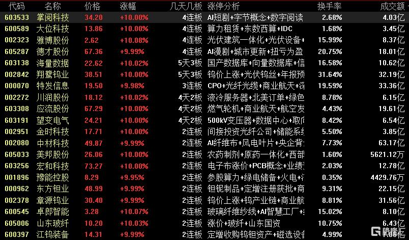 焦点股方面,算力租赁概念股大位科技4连板、特发信息7天4板,AI应用端的掌阅科技4连板、德才股份4连板,光伏板块雅博股份4连板。