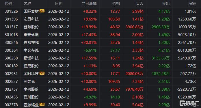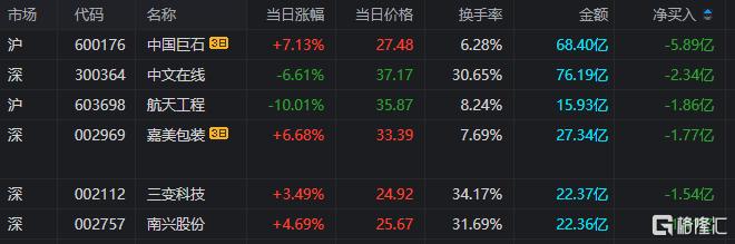 龙虎榜单日净卖出额前三为中文在线航天工程三变科技,分别为2.34亿元、1.86亿元、1.54亿元。