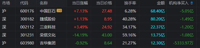 捷成股份:上涨1.13%,换手率40.28%,成交量909.99万手,成交额80.2亿元。龙虎榜数据显示,机构合计净卖出1.49亿元,北向资金合计净买入1.72亿元。
