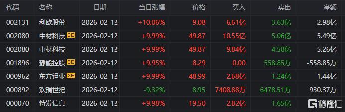龙虎榜单日净买入额前三为利欧股份英维克中材科技,分别为12.90亿元、9.34亿元、5.52亿元。
