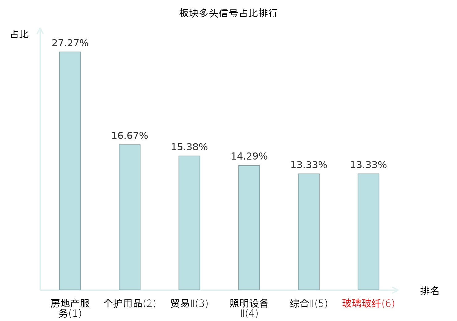 全市场所有行业板块中主力多头信号占比排名中,房地产服务板块位居第一。房地产服务板块名次提升最快,较昨日上升116位。