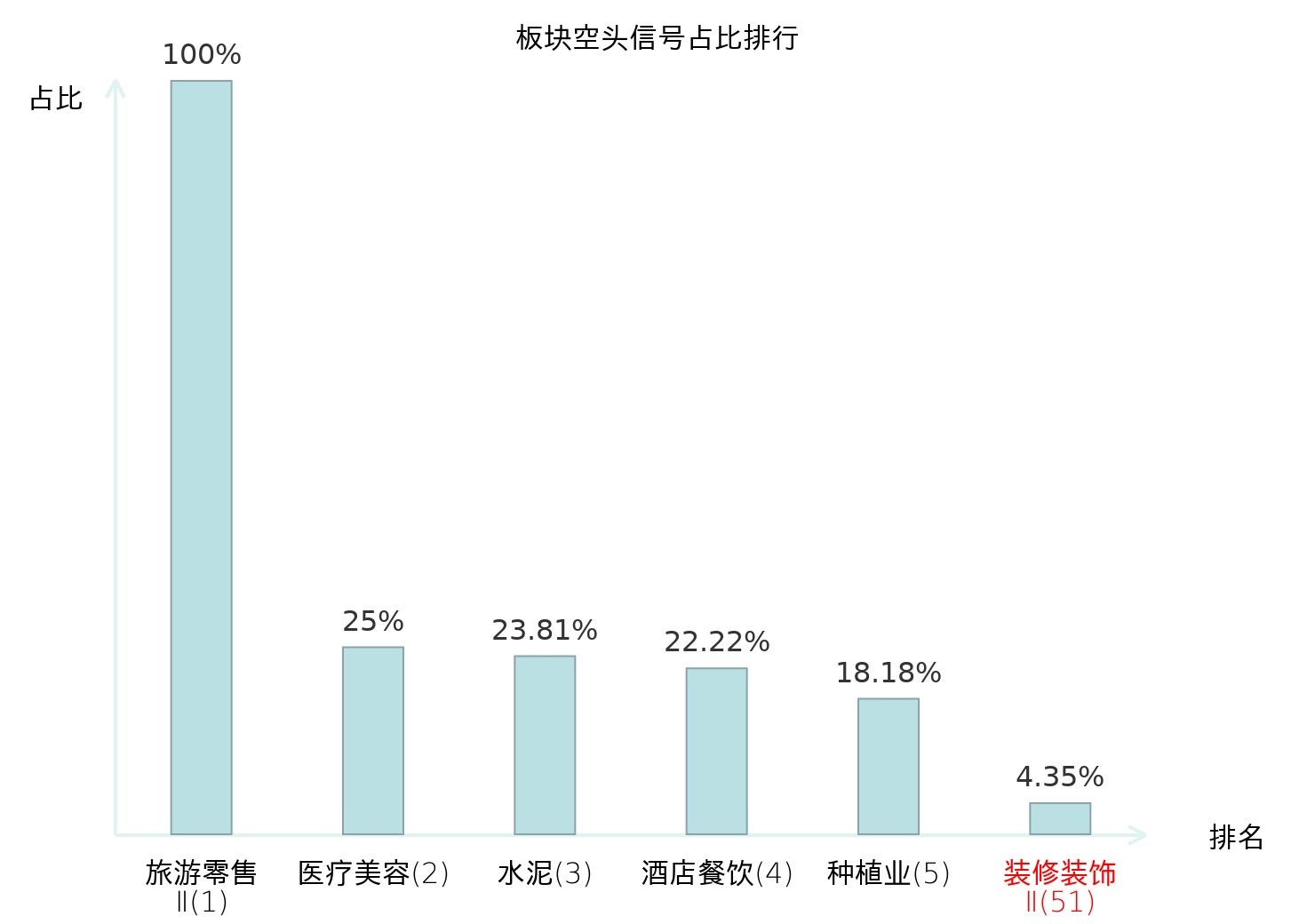 全市场所有行业板块中主力空头信号占比排名中,旅游零售Ⅱ板块位居第一。装修建材板块名次提升最快,较昨日上升112位。