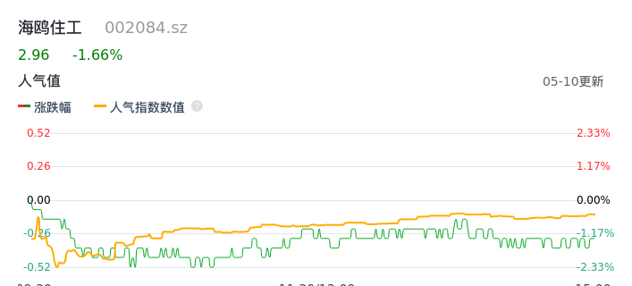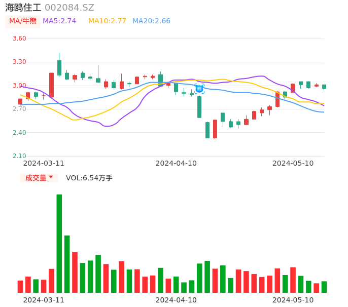 05月10日,海鸥住工收报2.96,股价涨幅-1.66%,成交金额1939.33万元,换手率1.01%。