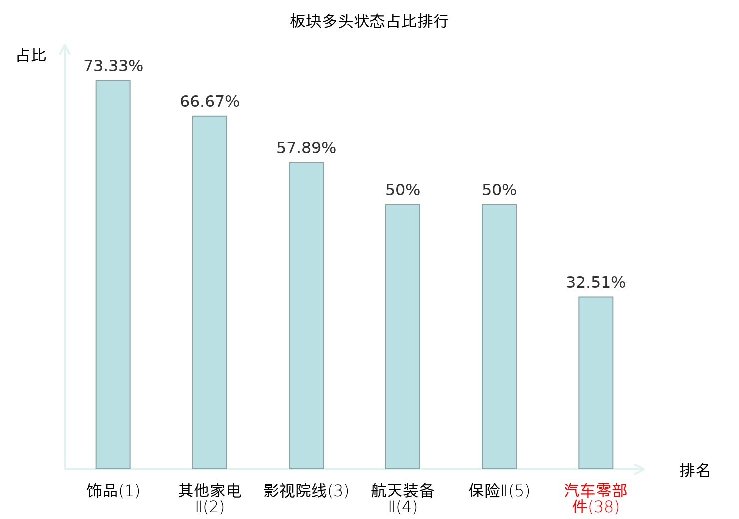 全市场所有行业板块中主力多头状态占比排名中,饰品板块位居第一。航天装备Ⅱ板块名次提升最快,较昨日上升109位。