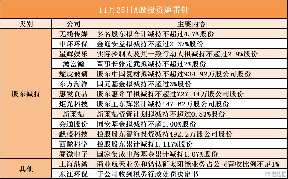 无线传媒多名股东拟合计减持不超过4.7%股份;中环环保股东金通安益拟减持不超过2.37%股份;星辉娱乐实际控制人及其一致行动人拟减持不超过2.9%股份;鸿富瀚董事长张定武拟减持不超过2%股份;耀皮玻璃股东中国复材拟减持不超过934.92万股公司股份;东方海洋股东国元基金拟减持不超过3%股份;惠发食品股东惠希平拟减持不超过727.14万股公司股份;上海港湾表示商业航天业务和钙钛矿太阳能业务占公司营收比例不足1%;东江环保子公司收到税务行政处罚决定书