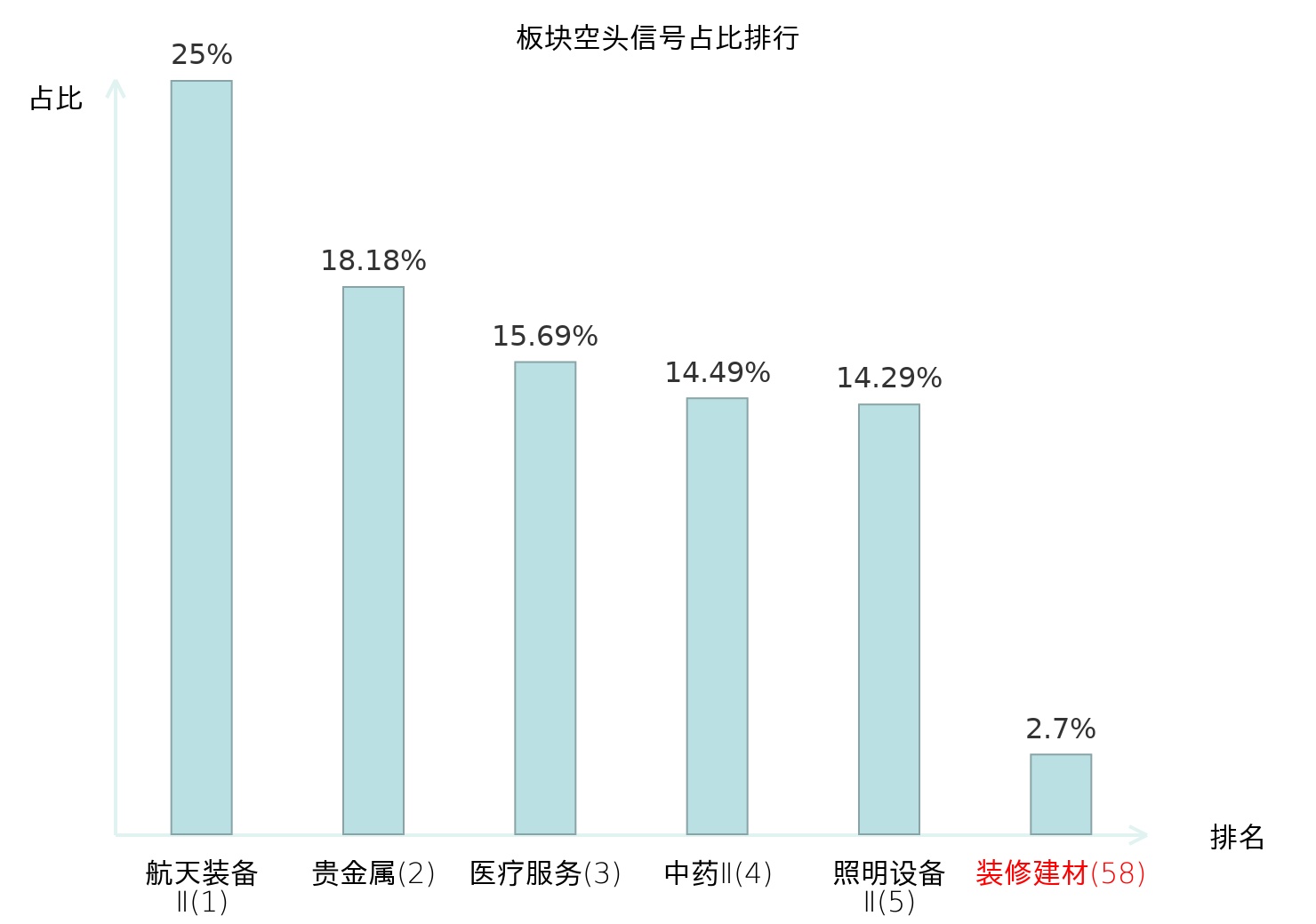 全市场所有行业板块中主力空头信号占比排名中,航天装备Ⅱ板块位居第一。物流板块名次提升最快,较昨日上升112位。