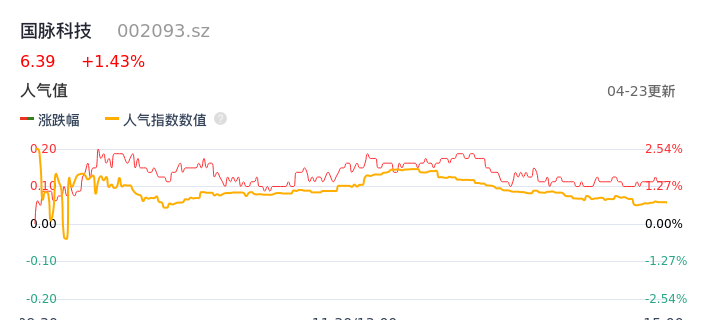 04月23日,国脉科技收报6.39,股价涨幅1.43%,成交金额4566.94万元,换手率0.71%。