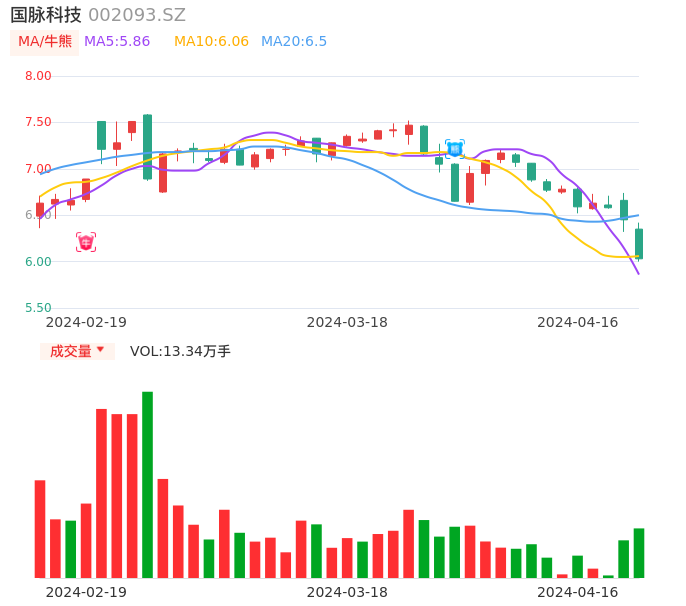 04月16日,国脉科技收报6.03,股价涨幅-6.51%,成交金额8197.86万元,换手率1.33%。