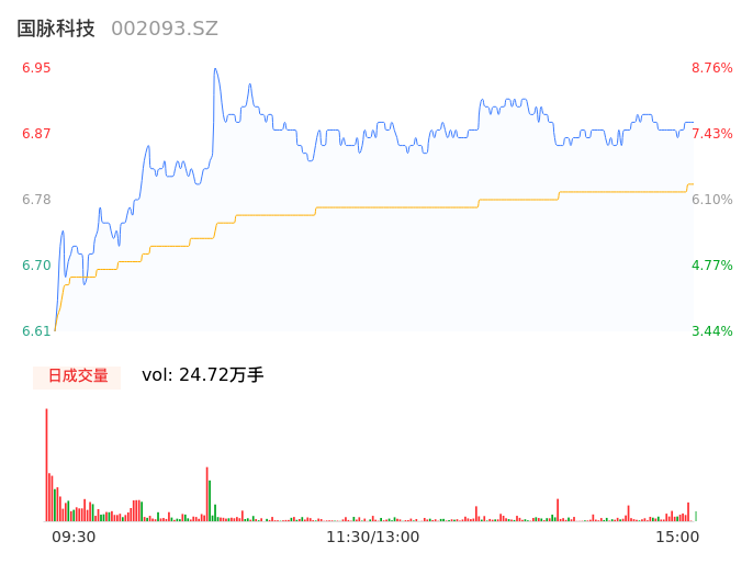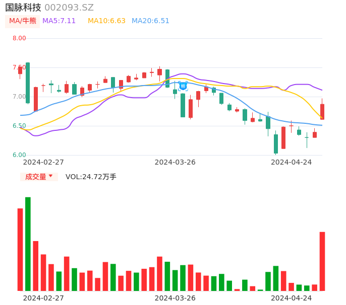 04月24日,国脉科技收报6.87,股价涨幅7.51%,成交金额1.68亿元,换手率2.46%。