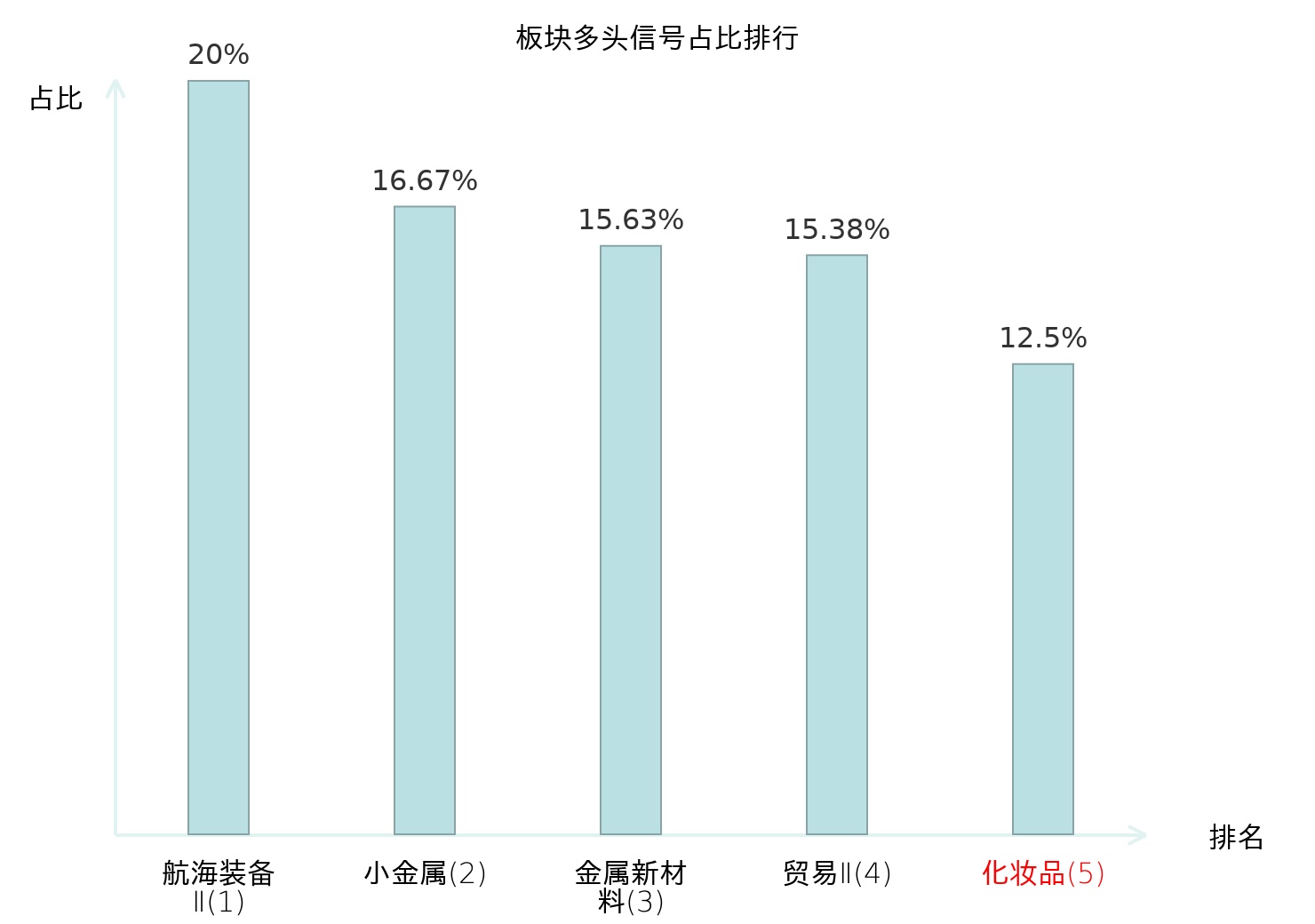 从主力宝信号数据分析,青岛金王所属的化妆品板块中共2只股票发出主力多头信号,主力多头信号占比在全行业中排名第5位,较昨日上升94位。排名的显著提升表明主力对化妆品板块的买入意愿增强,这对投资者判断该板块的短期走势具有重要参考价值。全市场所有行业板块中,航海装备Ⅱ板块的主力多头信号占比最高,位居第一;航海装备Ⅱ板块名次提升最快,较昨日上升115位。这些变动体现了主力资金在不同行业间的偏好变化,为投资者提供了市场动态的重要线索。