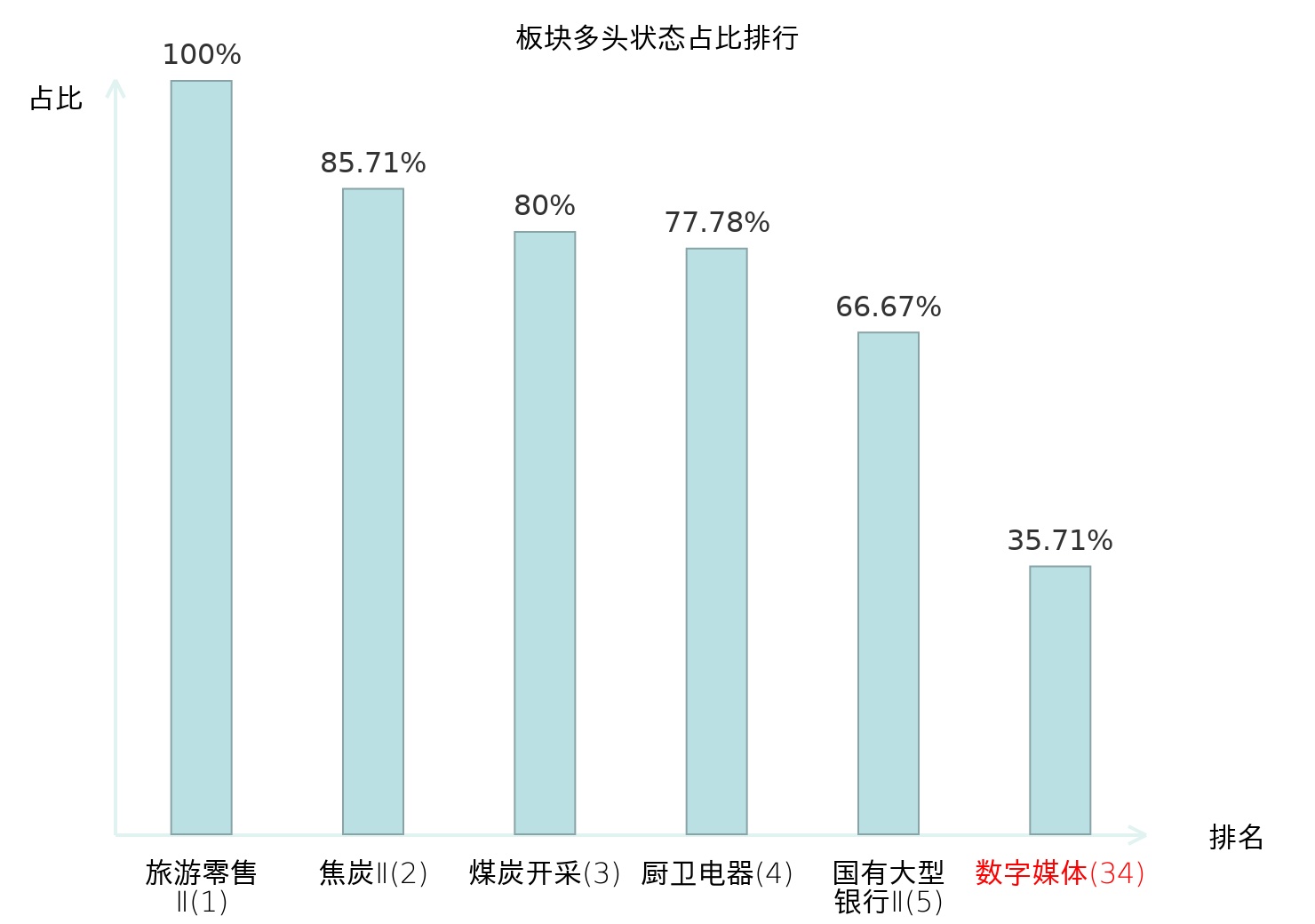 全市场所有行业板块中主力多头状态占比排名中,旅游零售Ⅱ板块位居第一。渔业板块名次提升最快,较昨日上升66位。
