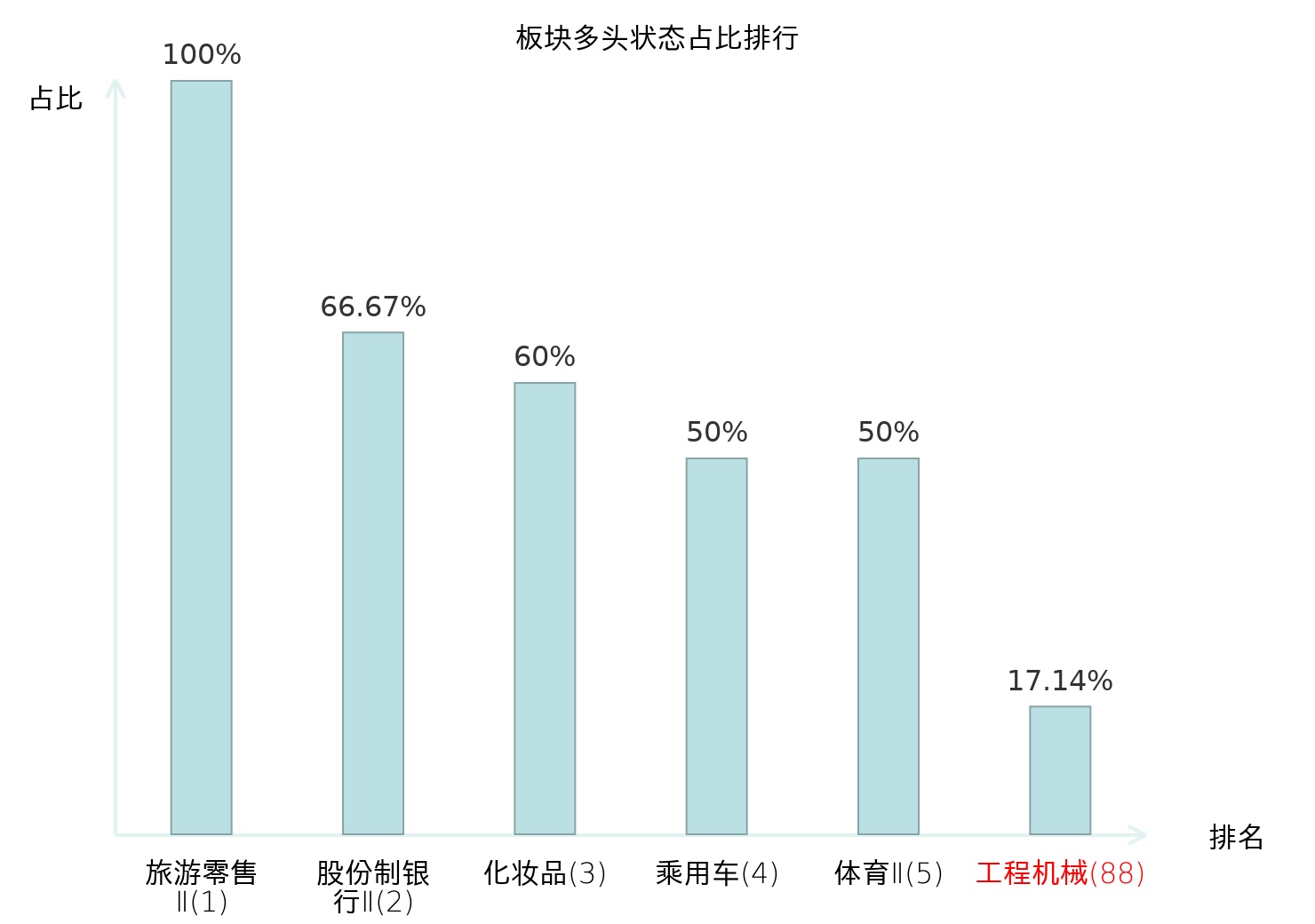 全市场所有行业板块中主力多头状态占比排名中,旅游零售Ⅱ板块位居第一。旅游零售Ⅱ板块名次提升最快,较昨日上升130位。