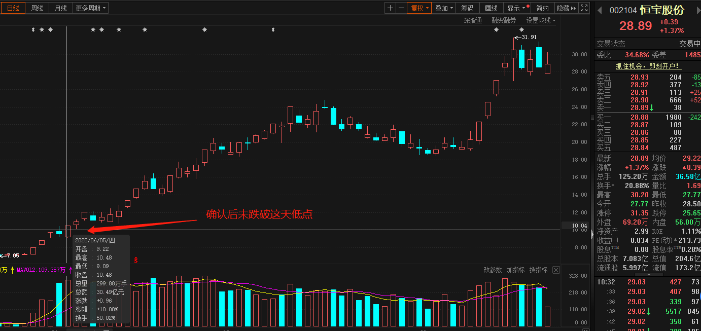比如6月5日的恒宝股份确认之后,后面再也没有跌破过6月5日的确认K线的低点。