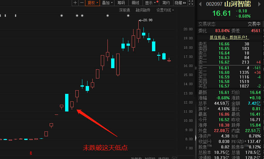 比如7月28日的山河智能确认之后,后面再也没有跌破过7月28日的确认K线的低点。