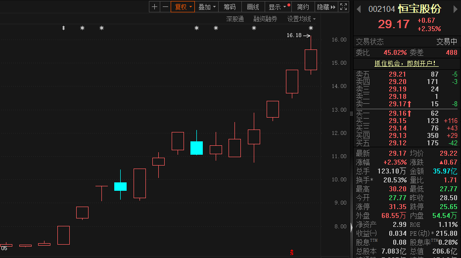 恒宝股份在6月5日之后,一直维持30亿以上的量能,同时换手基本上也是30%左右。