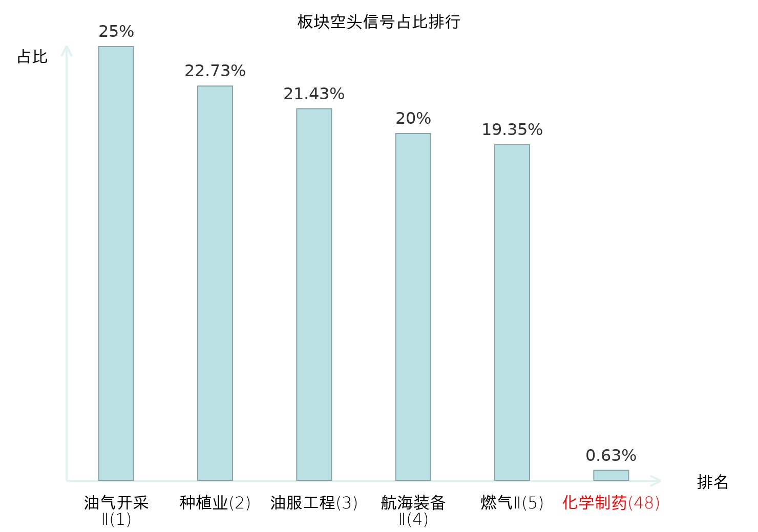 全市场所有行业板块中主力空头信号占比排名中,油气开采Ⅱ板块位居第一。专业工程板块名次提升最快,较昨日上升101位。