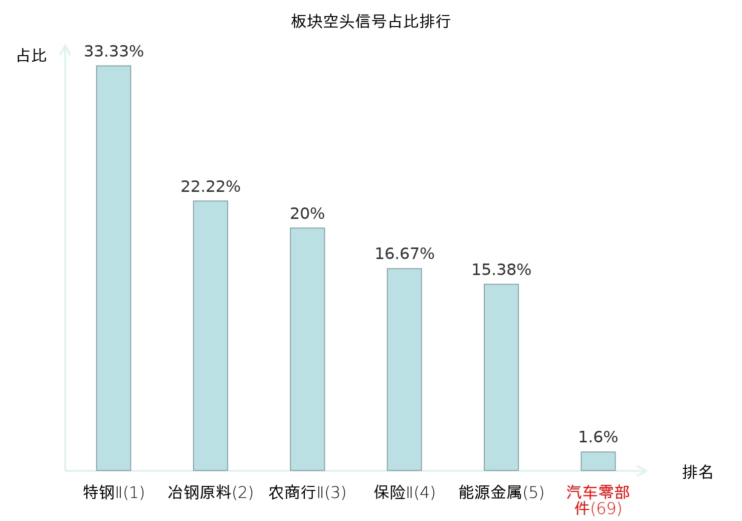 全市场所有行业板块中主力空头信号占比排名中,特钢Ⅱ板块位居第一。其他电子Ⅱ板块名次提升最快,较昨日上升117位。