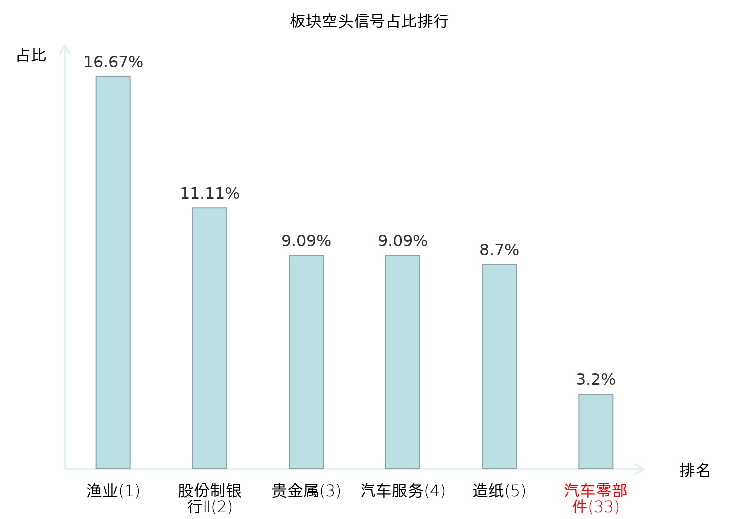 全市场所有行业板块中主力空头信号占比排名中,渔业板块位居第一。电机Ⅱ板块名次提升最快,较昨日上升113位。