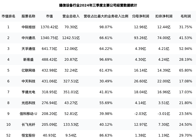 恒宝股份最新报告期数据为三季度,下表汇总了通信设备行业内市值靠前的公司三季度主要经营数据