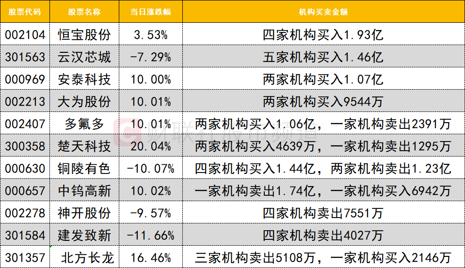 卖出方面,中钨高新遭一家机构卖出1.74亿,同时获一家机构买入6942万。