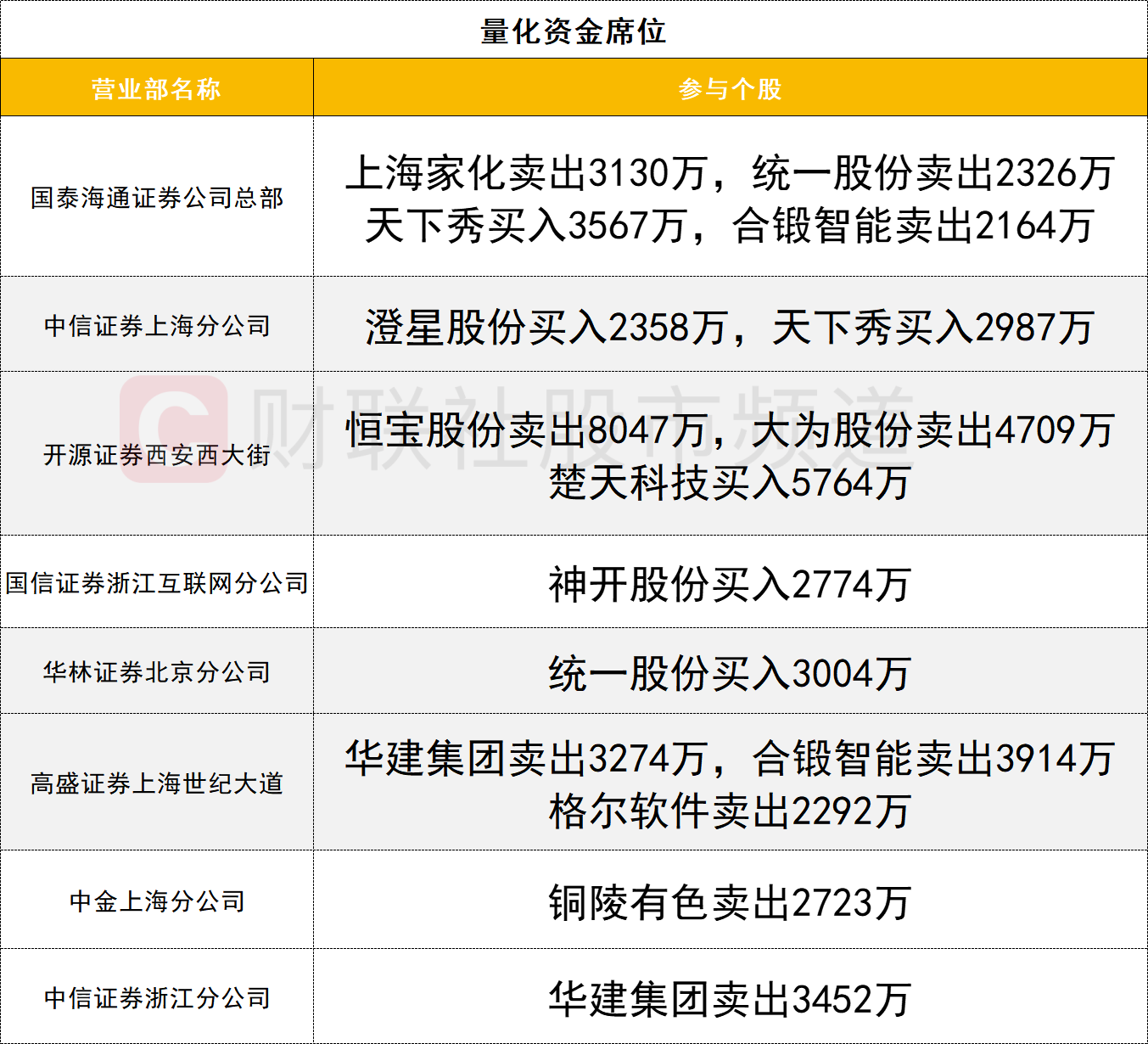 量化资金活跃度一般,天下秀获两家量化席位合计买入6554万。