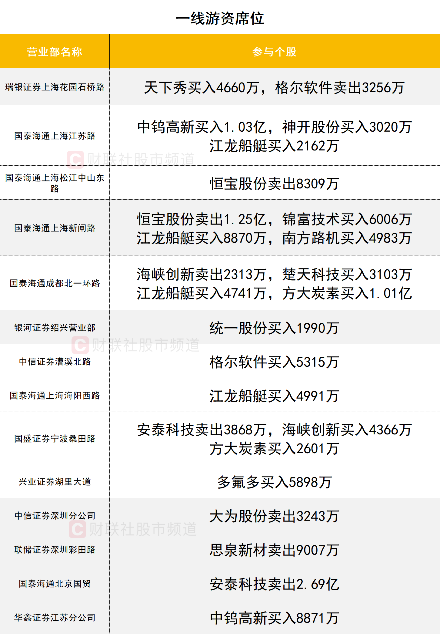 一线游资活跃度较高,中钨高新获两家实力游资(国泰海通证券上海江苏路和华鑫证券江苏分公司)分别买入1.03亿元和8871万元。恒宝股份遭国泰海通证券上海新闸路席位卖出1.25亿,同时遭国泰海通证券上海中山东路席位卖出8309万。安泰科技遭国泰海通证券北京国贸席位卖出2.69亿。