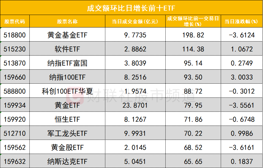 从成交额环比增长前十的ETF来看,黄金基金ETF(518800)成交额环比增长198%位居首位;软件ETF(515230)成交额环比增长114%位居次席。