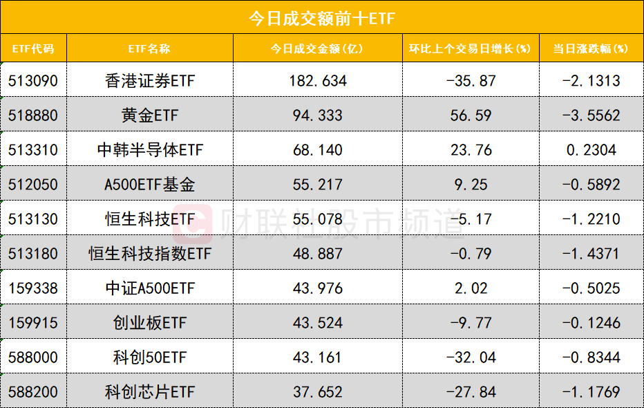 从成交额前十的ETF来看,香港证券ETF(513090)成交额位居首位,黄金ETF(518880)成交额位居次席。