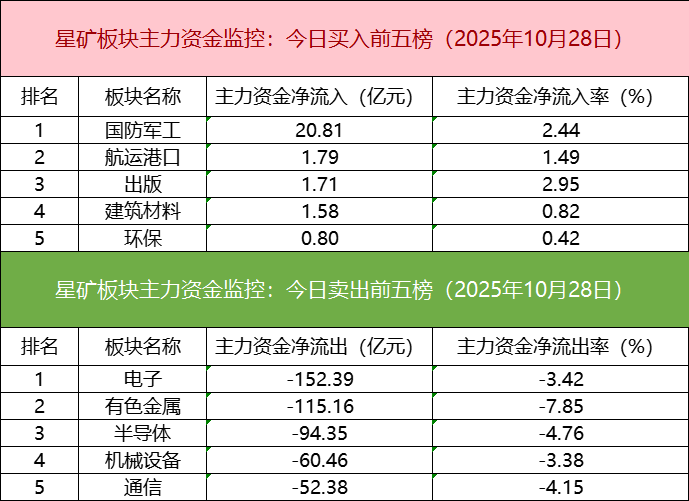 从主力板块资金监控数据来看,国防军工板块主力资金净流入居首。