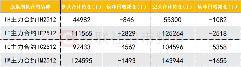 四大期指主力合约中,IH、IF、IC、IM合约多空双方均减仓,IC、IM合约空头减仓数量较多。