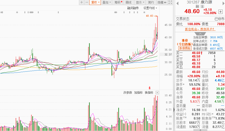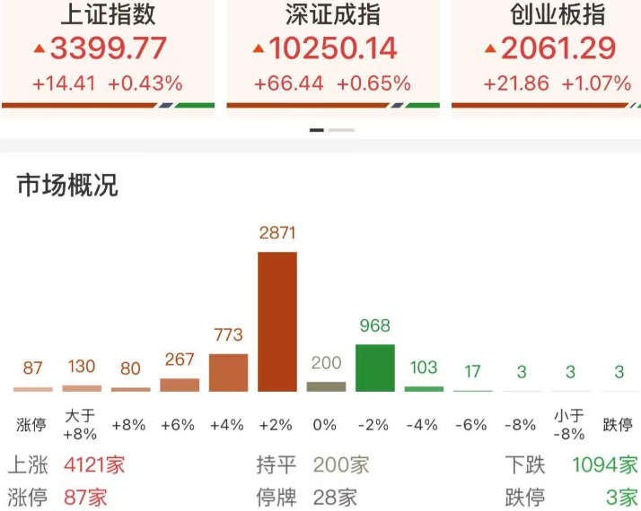市场情绪:盘中再上3400,市场热点快速轮动,个股涨多跌少,全市场超4100只个股上涨。今日共65股涨停,连板股总数13只,36股封板未遂,封板率为64%(不含ST股、退市股)。焦点股方面,核电板块再度活跃,百利电气走出16天9板,高位人气股合锻智能、中超控股涨停;体育产业链午后大涨,共创草坪晋级6连板,康力源20CM涨停。