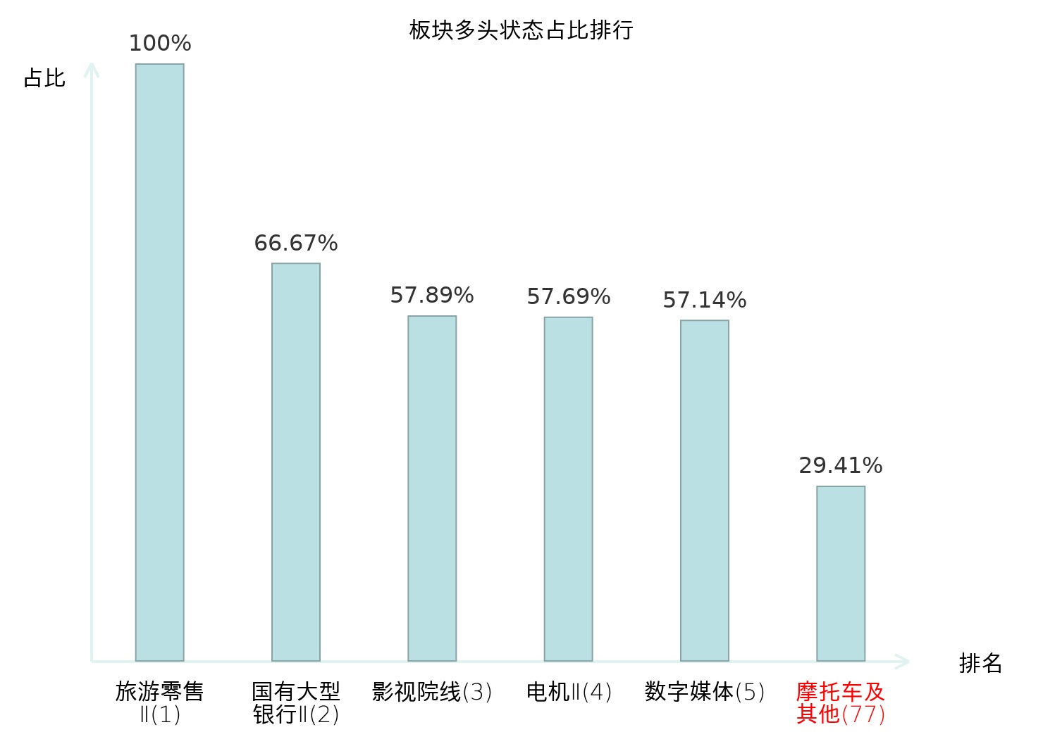全市场所有行业板块中主力多头状态占比排名中,旅游零售Ⅱ板块位居第一。专业连锁Ⅱ板块名次提升最快,较昨日上升56位。