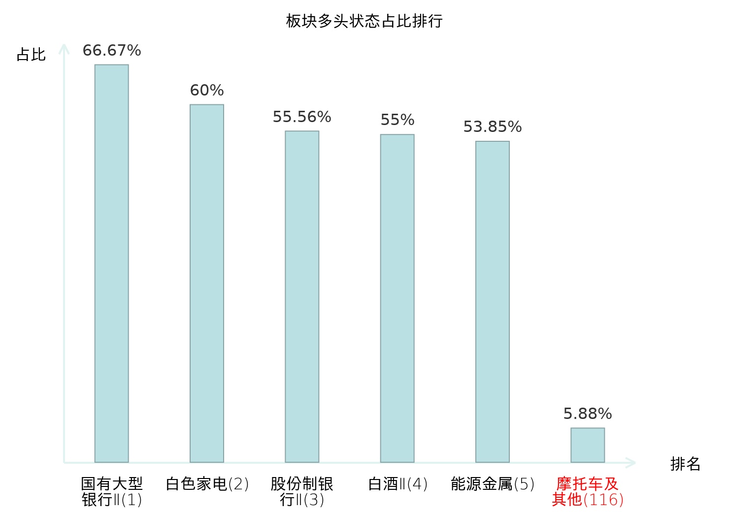 全市场所有行业板块中主力多头状态占比排名中,国有大型银行Ⅱ板块位居第一。林业Ⅱ板块名次提升最快,较昨日上升99位。