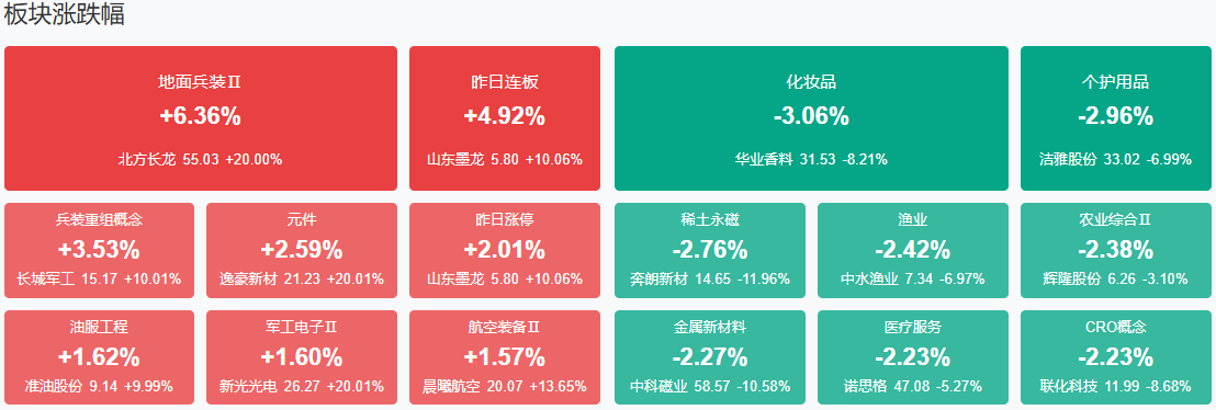 板块方面,军工、PCB、白酒、油气等板块涨幅居前,美容护理、稀土永磁、CRO、农药等板块跌幅居前。截至收盘,沪指跌0.2%,深成指跌0.15%,创业板指跌0.36%。