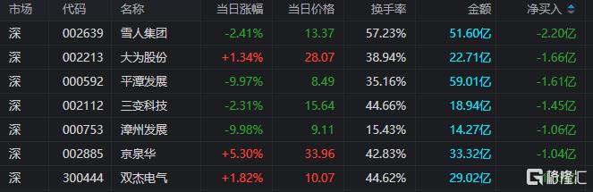龙虎榜单日净卖出额前三为雪人集团、大为股份、平潭发展,分别为2.2亿元、1.66亿元、1.61亿元。